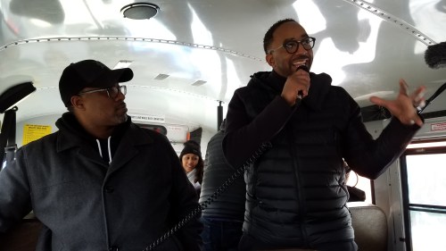 May 2016: Hajj Flemings, CEO of Rebrand Cities with renowned photographer, Shawn Lee, in a redesigned school bus en route to working with small business owners in Detroit.